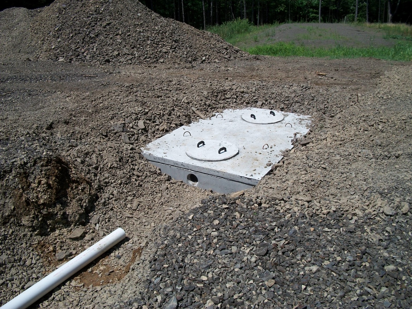 I arrived just after the septic tank was set in the ground. If only I hadn't taken the long way to the site I could have seen it lowering in the ground. It is a 1,000 gallon tank as per the County Health Department.